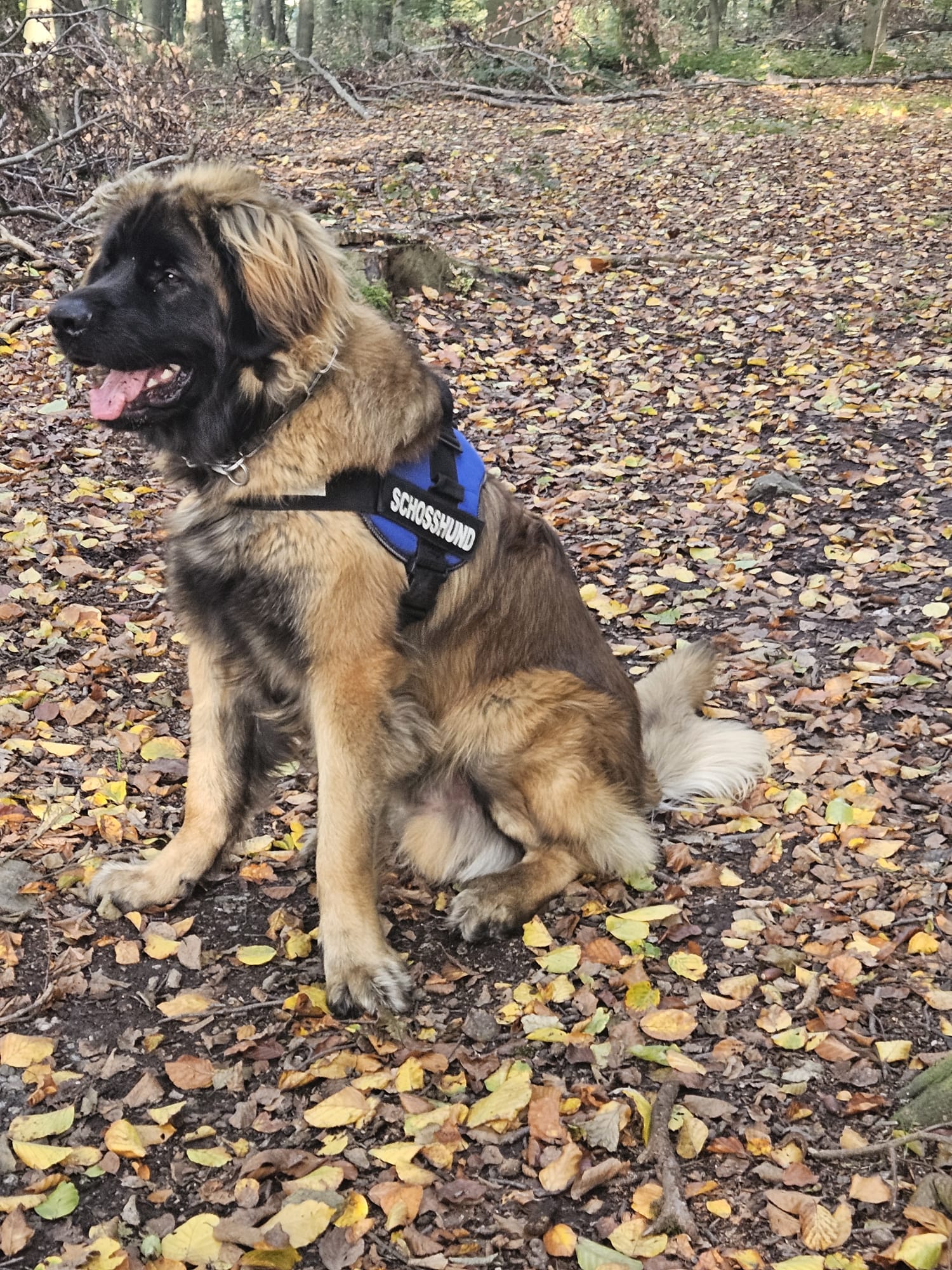 Der Leonberger-Hund Ayko und die vier Kater namens Devil, Asterix, Hades und Loki.