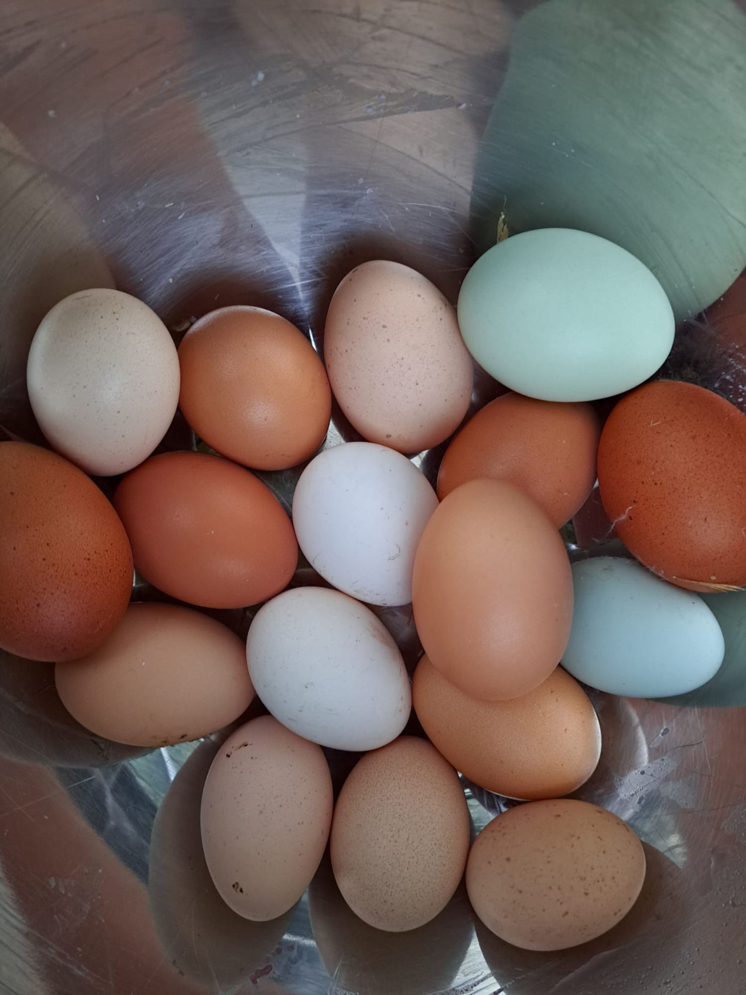 Die Eier (in den Farben weiß, gelblich, hellbraun, grün, bläulich und auch schokobraun) werden gemeinsam eingesammelt, und entweder zum Kochen oder zum Backen benutzt.